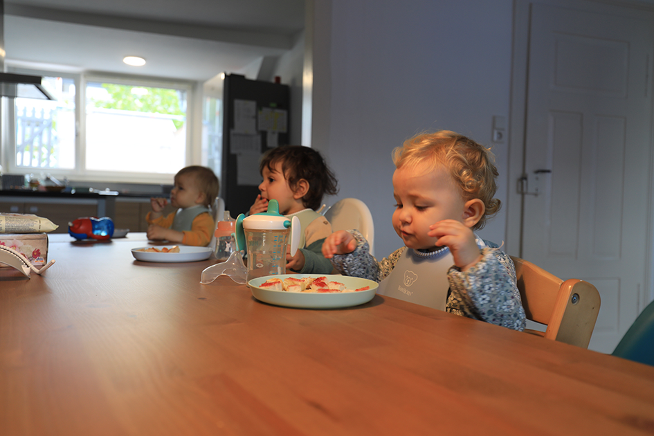 Bei den Mahlzeiten dürfen die Kinder erlernte Fähigkeiten praktisch umsetzen. Die Jüngsten werden beim Essen und Trinken unterstützt, die etwas älteren Kinder üben sich im selbstständigen Löffeln, Schöpfen und Einschenken.